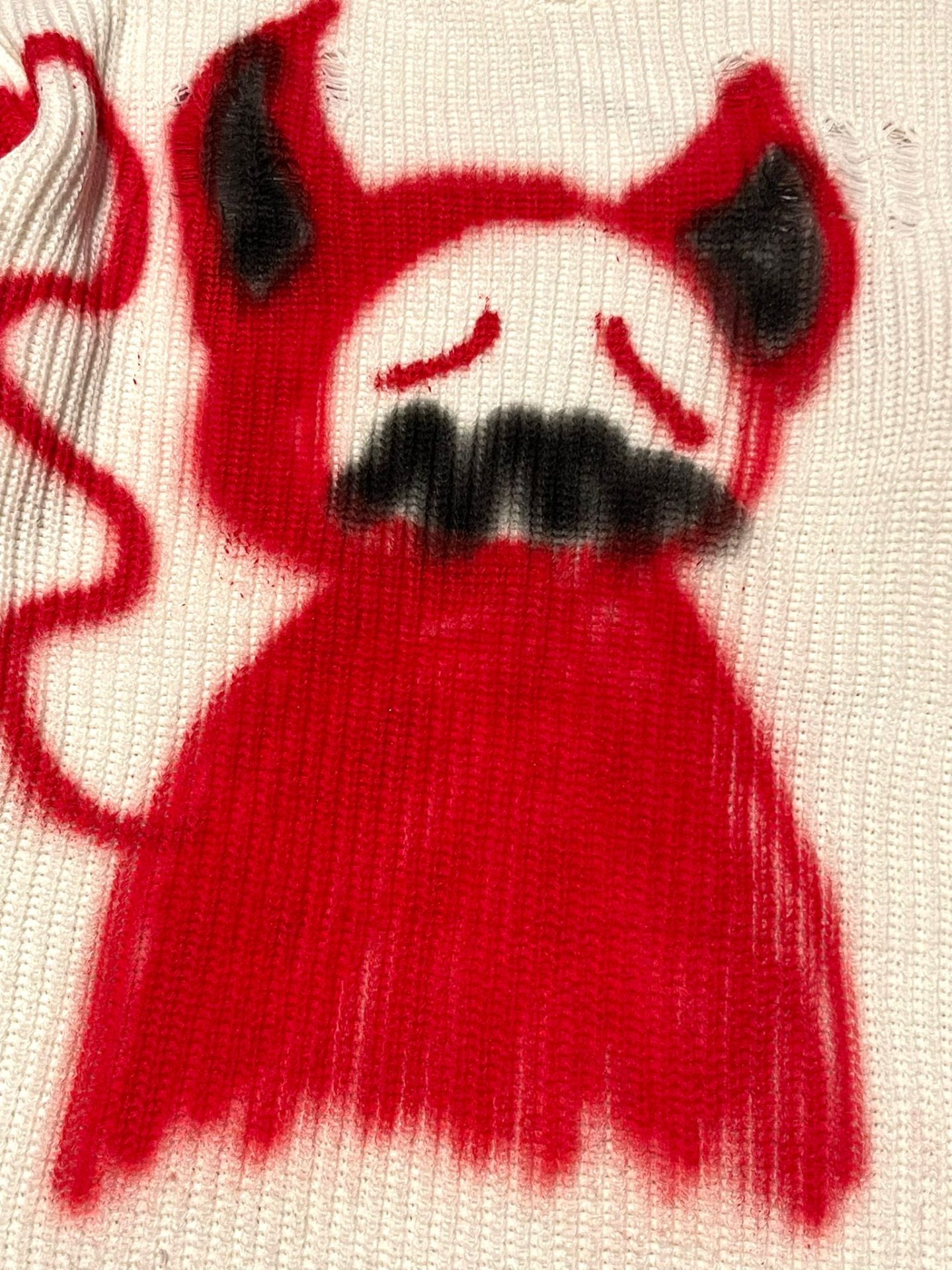 O piesă care poartă amprenta pură a expresiei urbane, acest pulover "Red Devil" combină estetica street cu tehnica ta personală de spray-art. Tricotul gros, în nuanță ivory, servește ca un "canvas" texturat pentru personajul pictat manual, un demon stilizat, conturat în roșu intens și negru, cu linii brute și energie artistică nefiltrată.