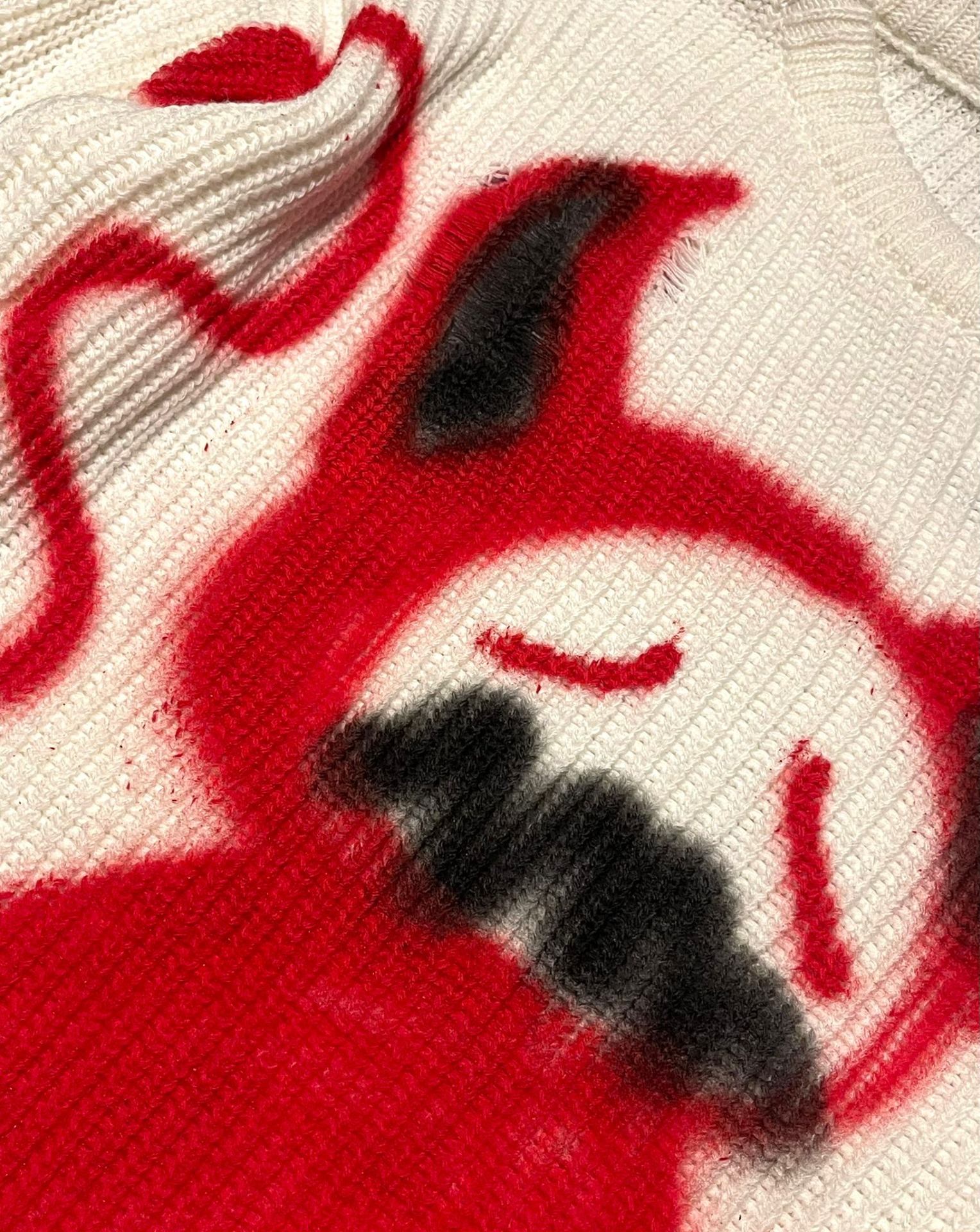 Detaliile distressed de la manșete și tiv, arse și destrămate intenționat, completează look-ul raw și adaugă vibrația aceea de piesă trăită, nu doar purtată. Fiecare pulover este unic, datorită desenului realizat manual cu spray, ceea ce îl transformă într-o lucrare de artă individuală, imposibil de reprodus identic.