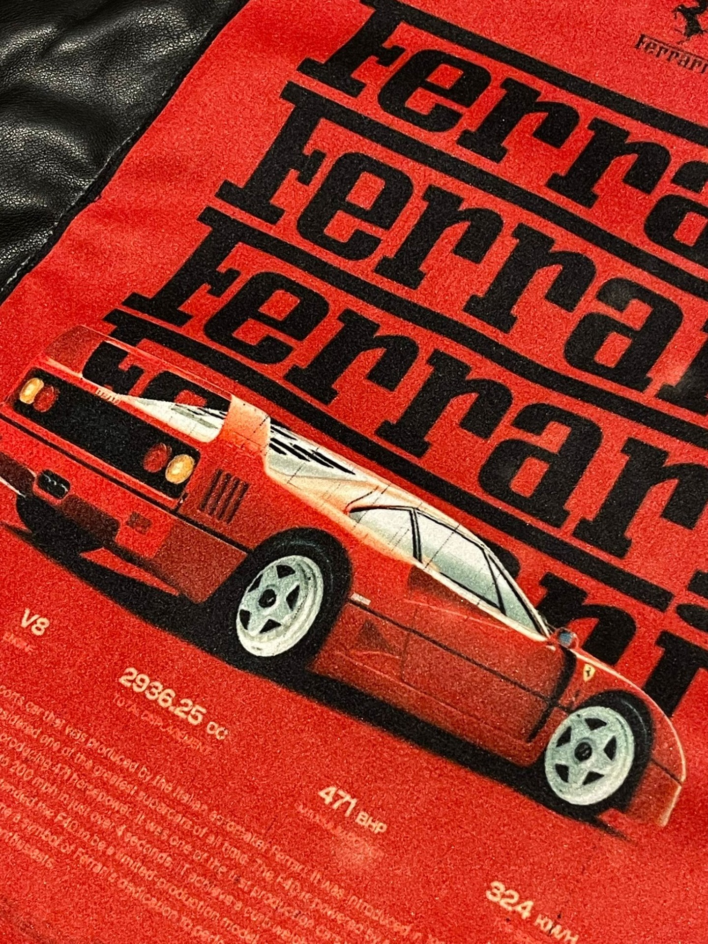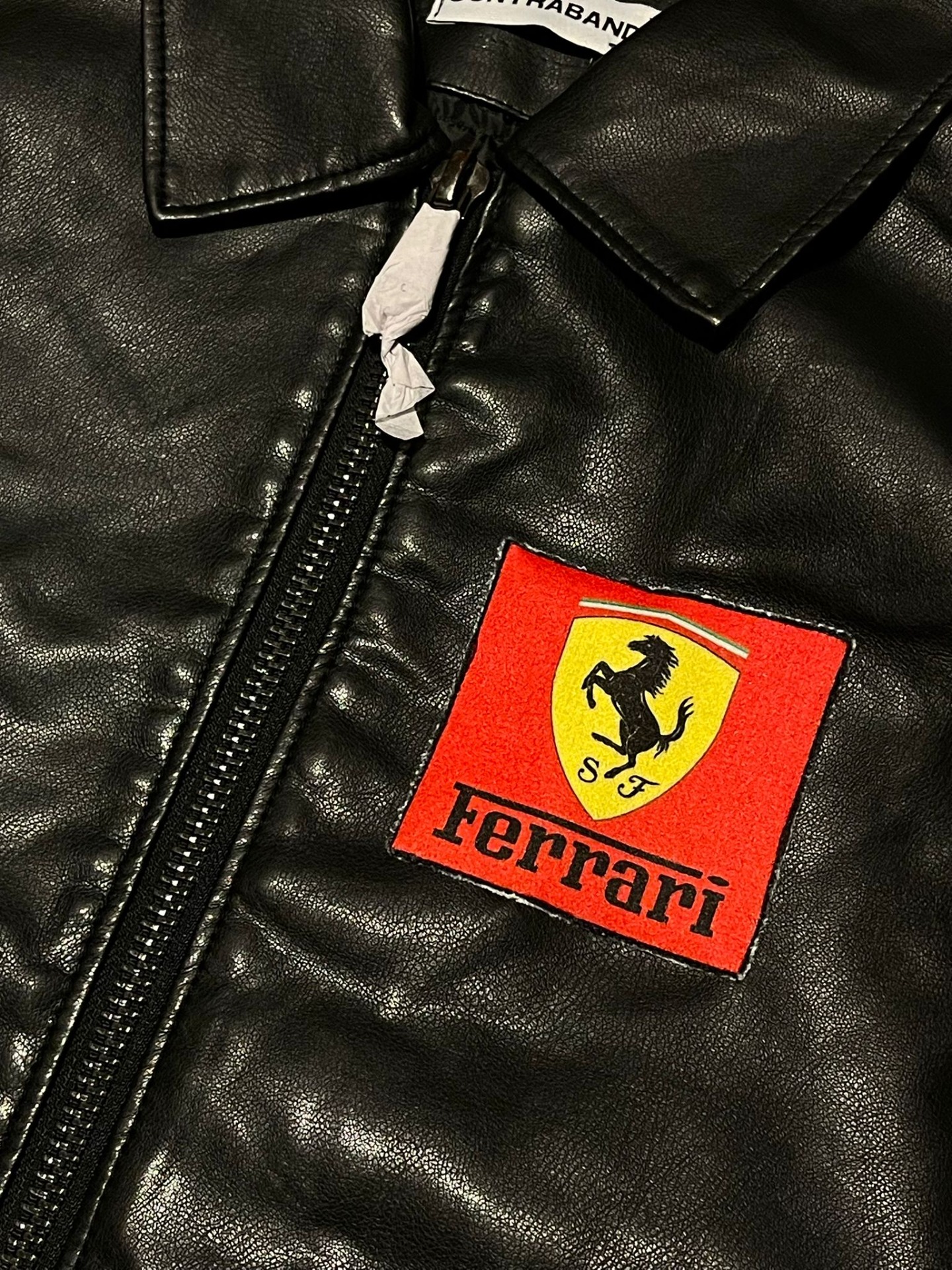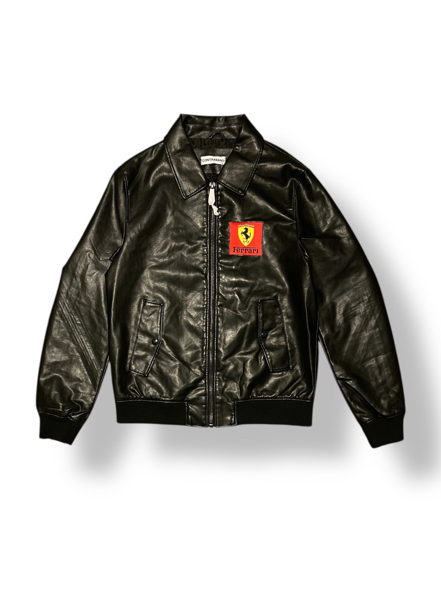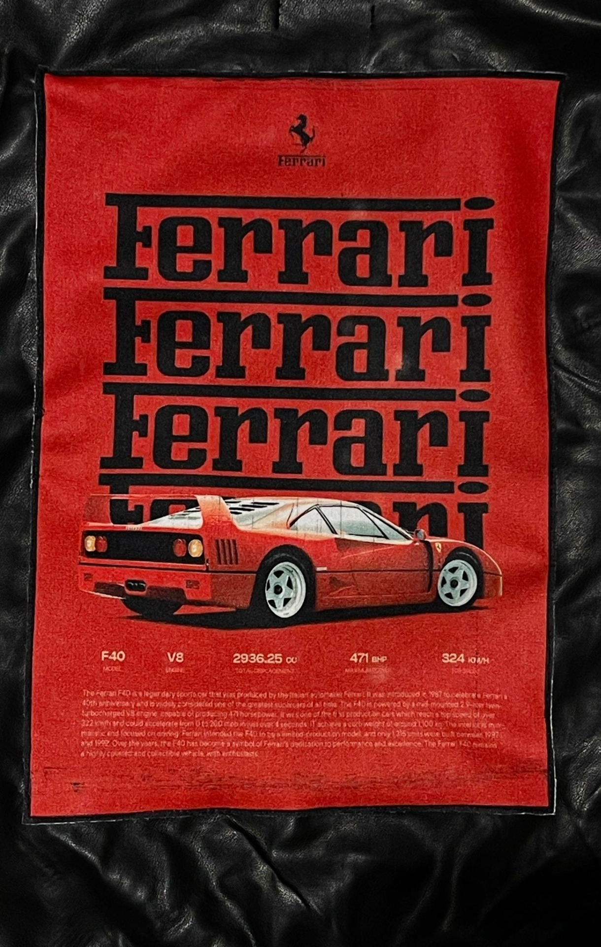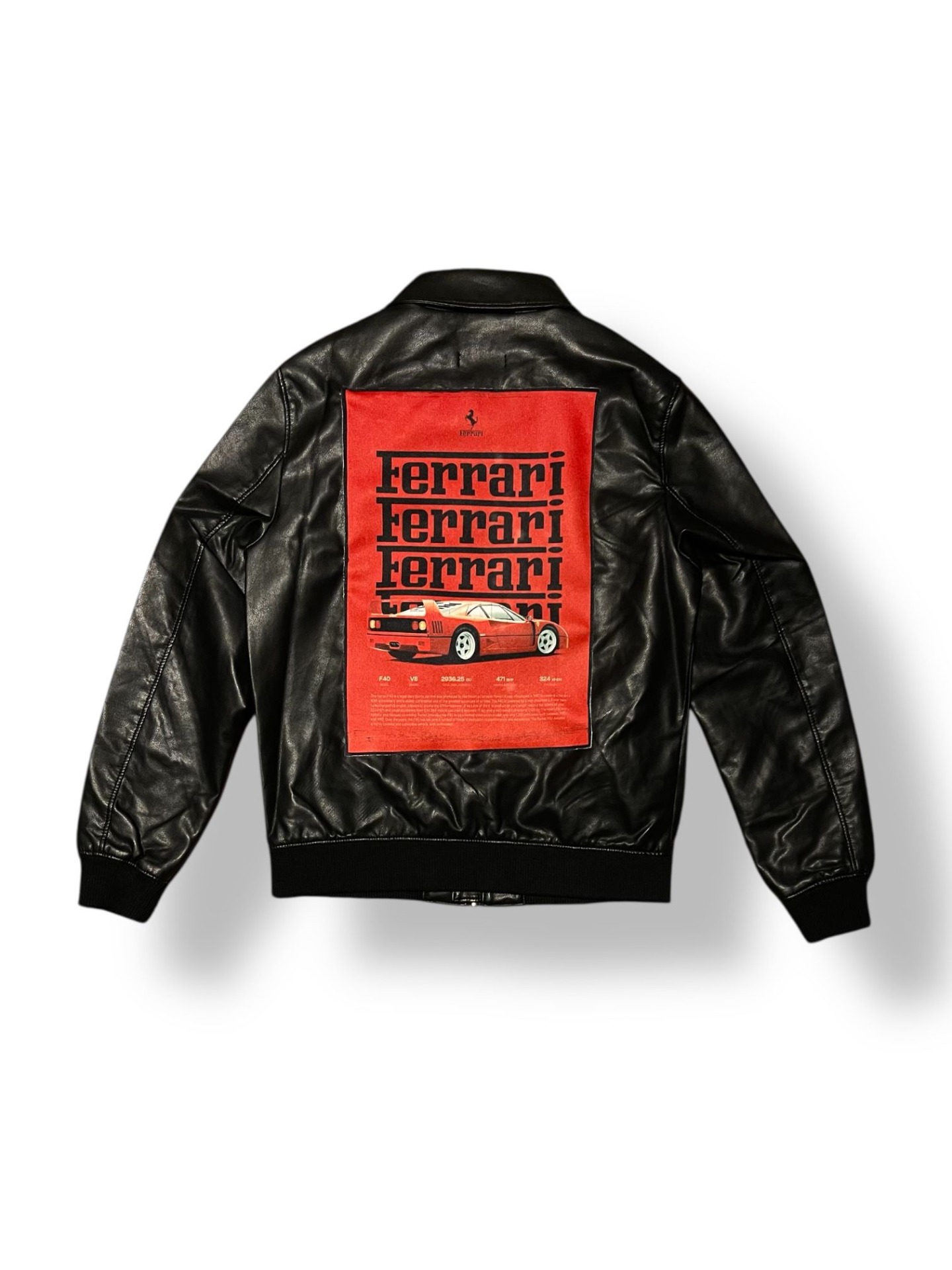 Geacă neagră din piele vegană cu vibe puternic streetwear și accente retro inspirate din estetica posterelor auto clasice. Patch-ul mare, creat și aplicat manual, transformă spatele gecii într-o piesă de artă grafică vibrantă, cu nuanțe intense de roșu și lettering bold, perfect contrastat pe finisajul lucios al pielii eco.