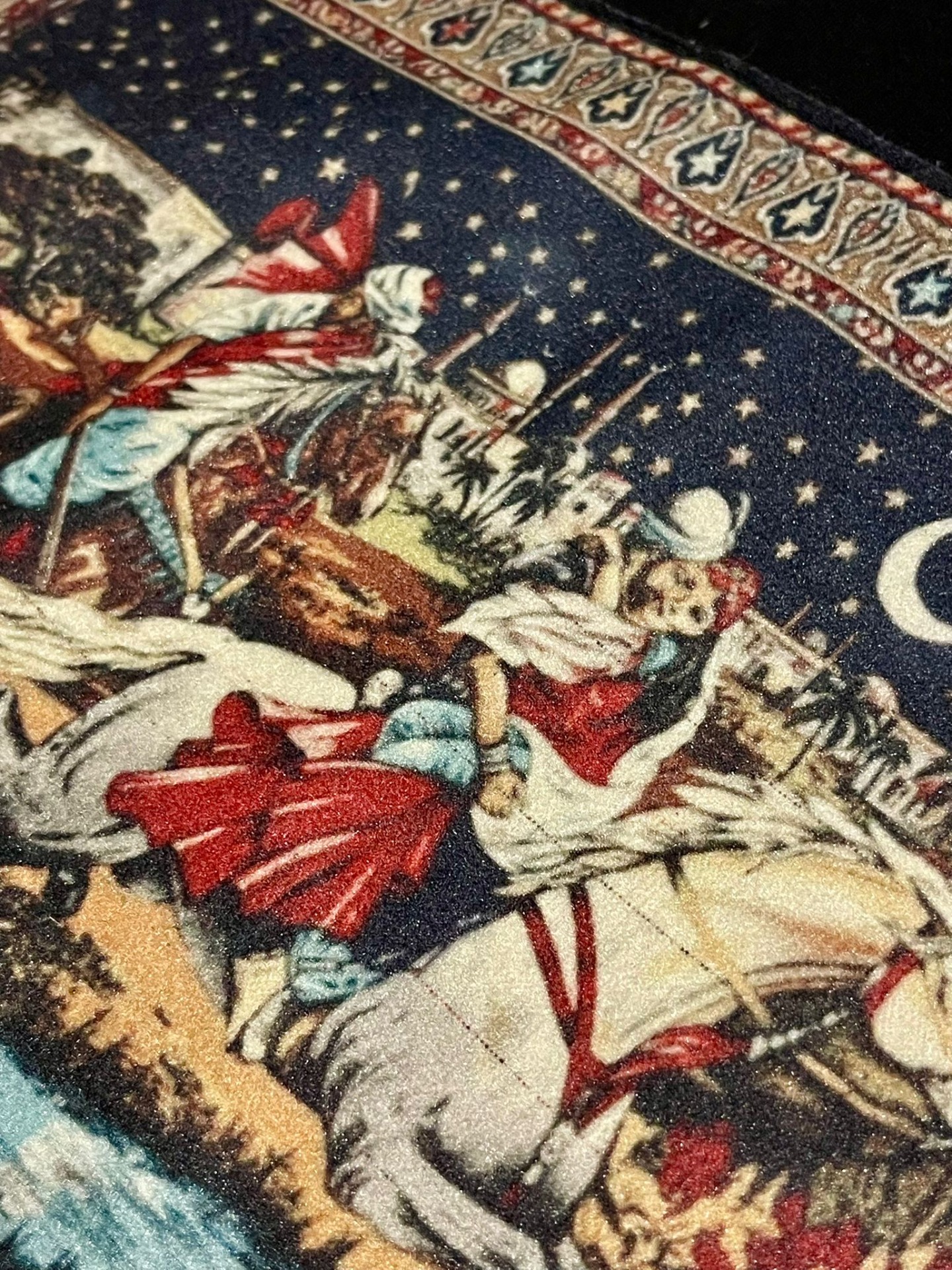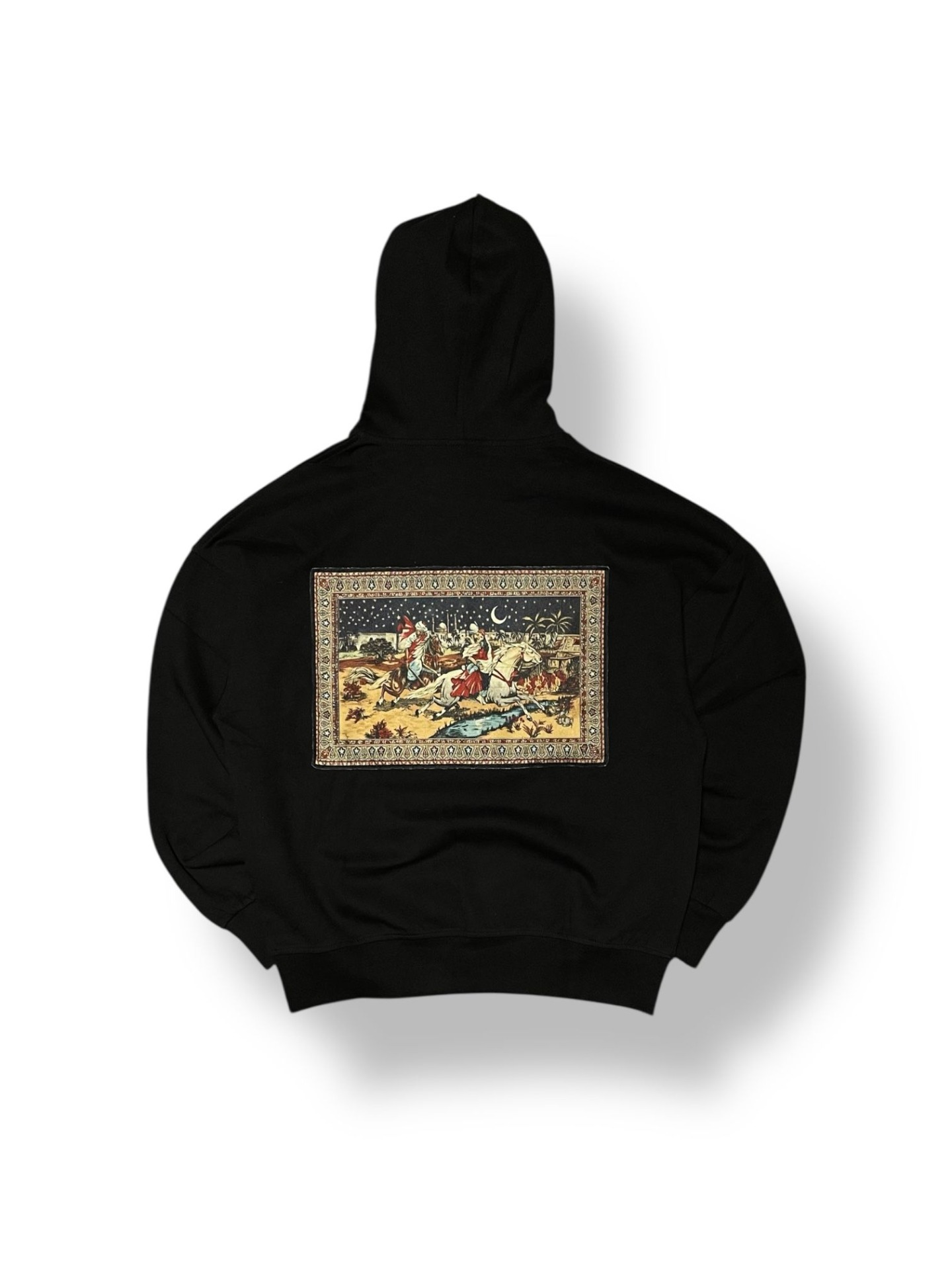 Transformă-ți stilul cu un hanorac unicat, realizat manual în atelierul CONTRABAND. Piesa se remarcă prin aplicația sa textilă premium, inspirată din arta orientală, ce ilustrează o scenă spectaculoasă cu un călăreț în plină mișcare. Fiecare detaliu al broderiei este atent selectat și aplicat manual, astfel încât fiecare hanorac devine o piesă de colecție cu personalitate proprie.
