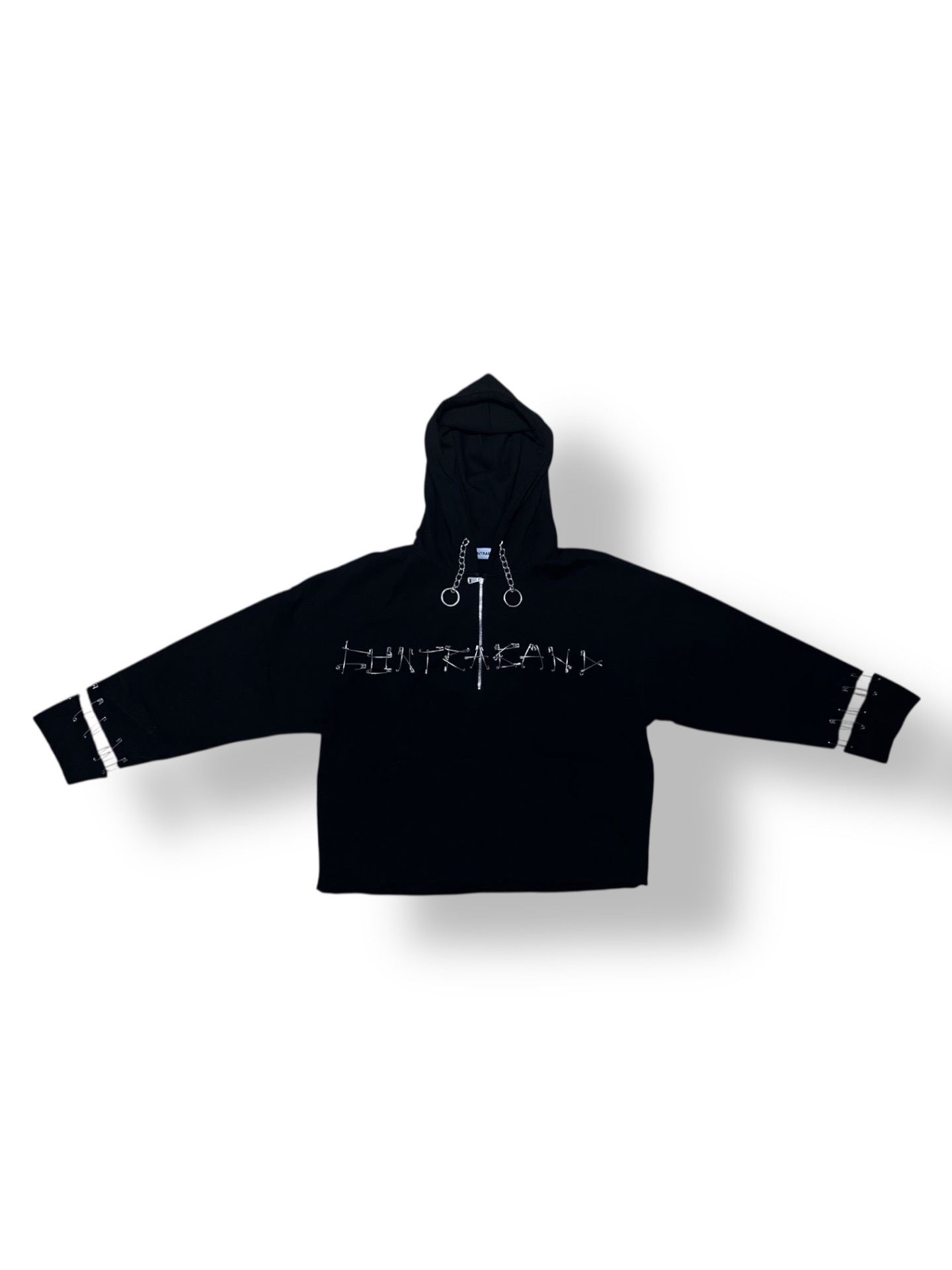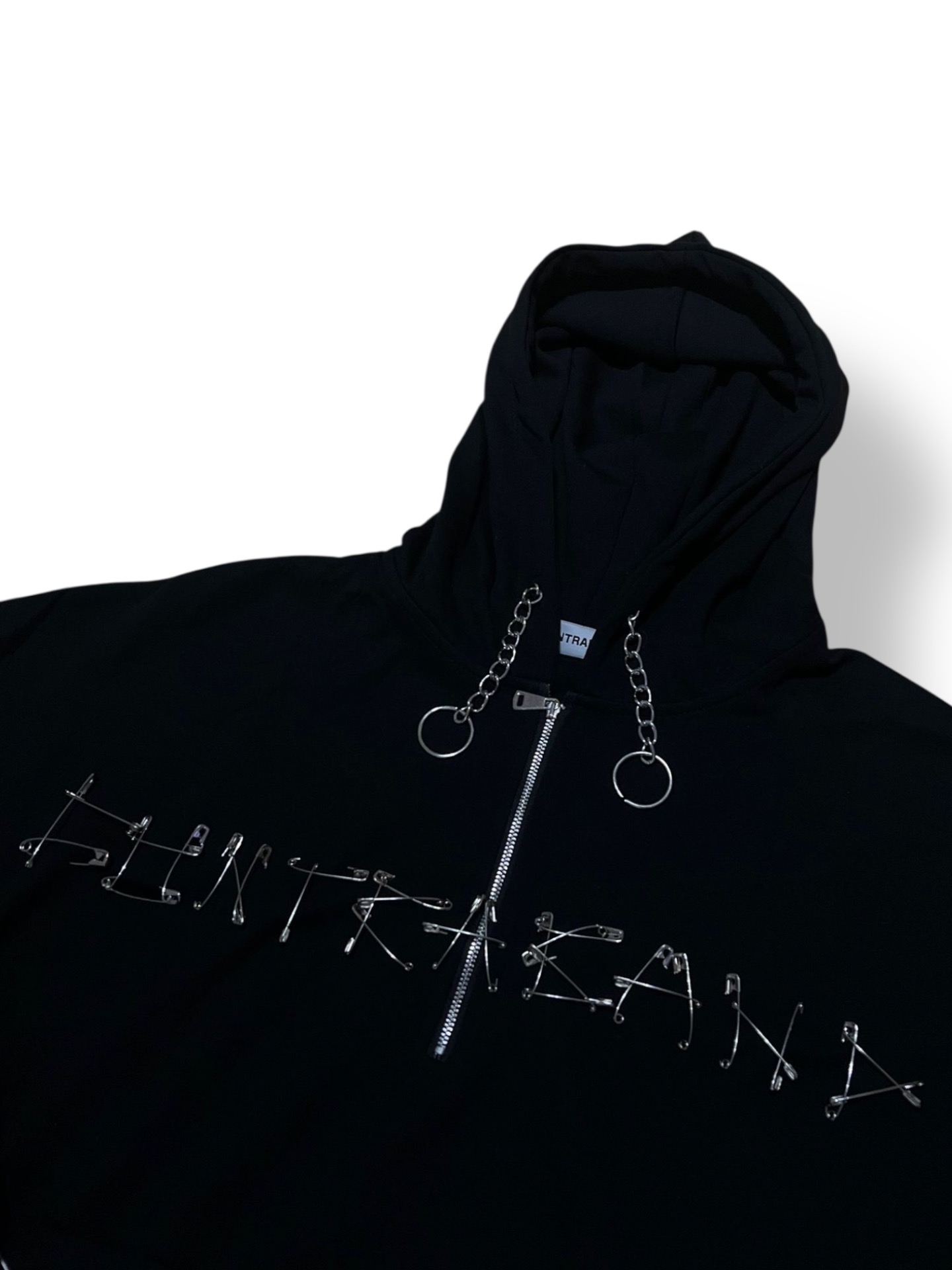 Modelul include detalii metalice pe mâneci și lanțuri decorative la glugă, adăugând un accent urban și nonconformist.