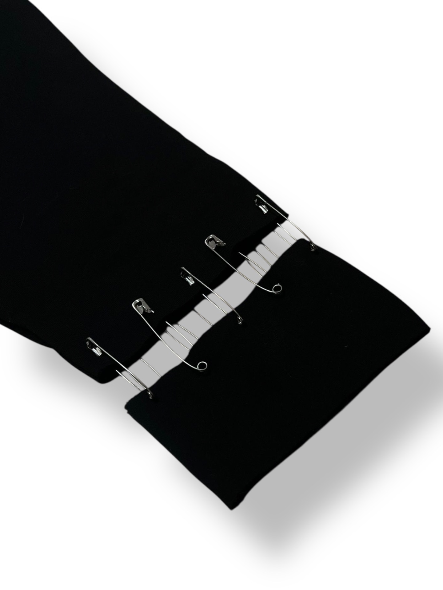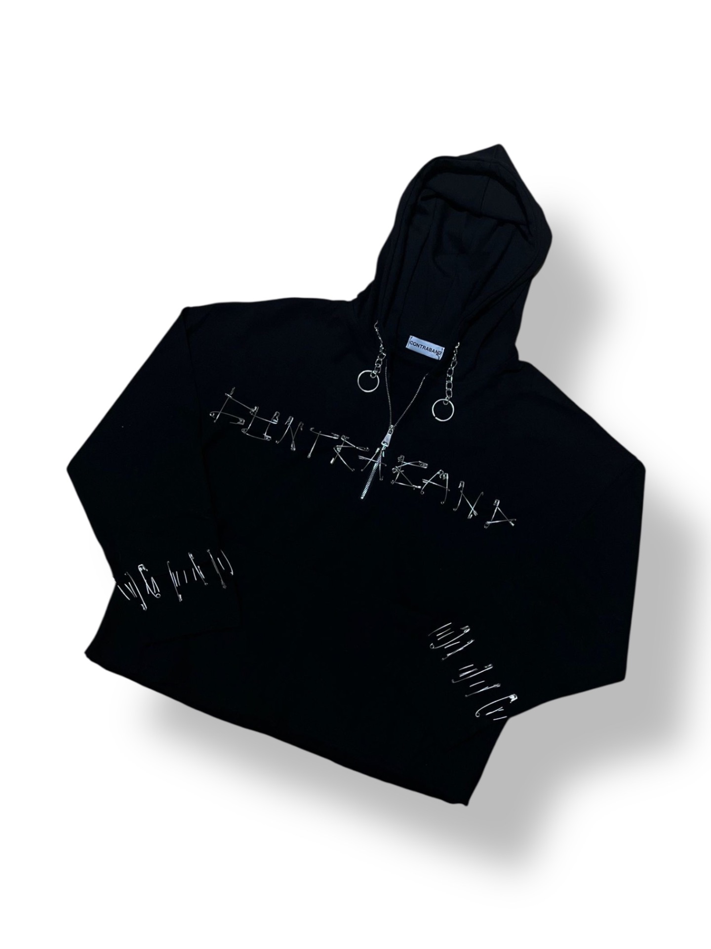 Pe partea frontală, inscripția "Contraband" este creată din ace de siguranță metalice, oferind o estetică puternică, industrială și rebelă.