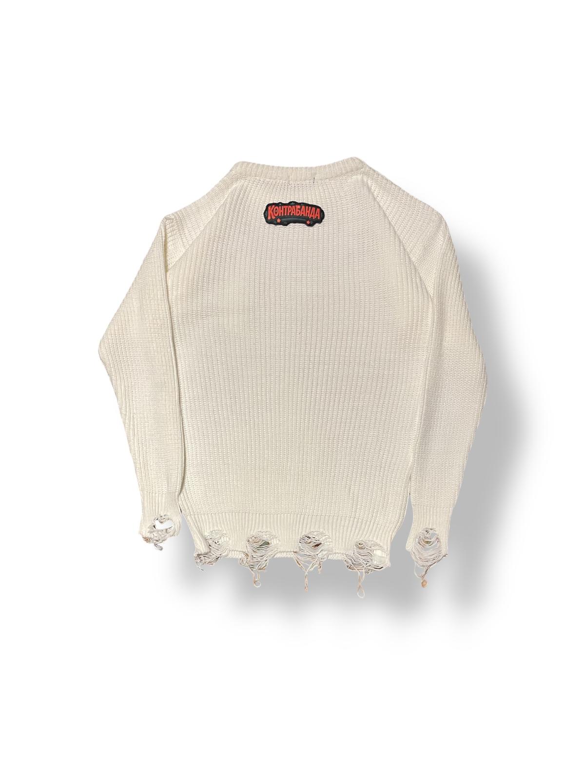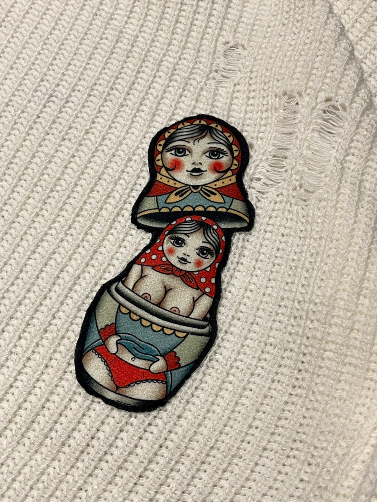 Pulover oversized din tricot crem, cu detalii distressed și margini intenționat destrămate, pentru un look relaxat, modern și ușor rebel. Patch-ul aplicat manual, o matrioska reinterpretată în stil grafic și aduce piesei o notă ludică, artistică și neașteptată.