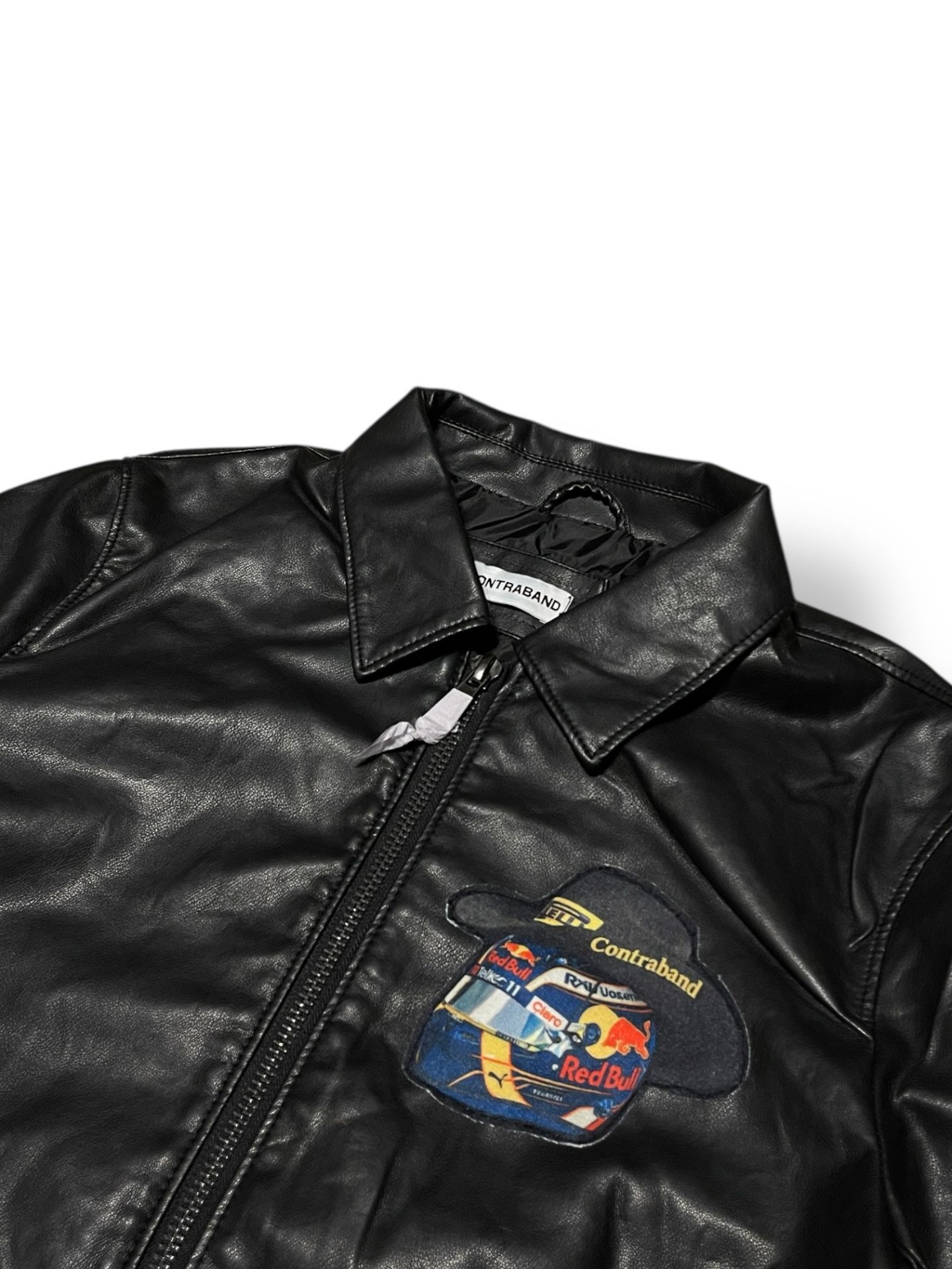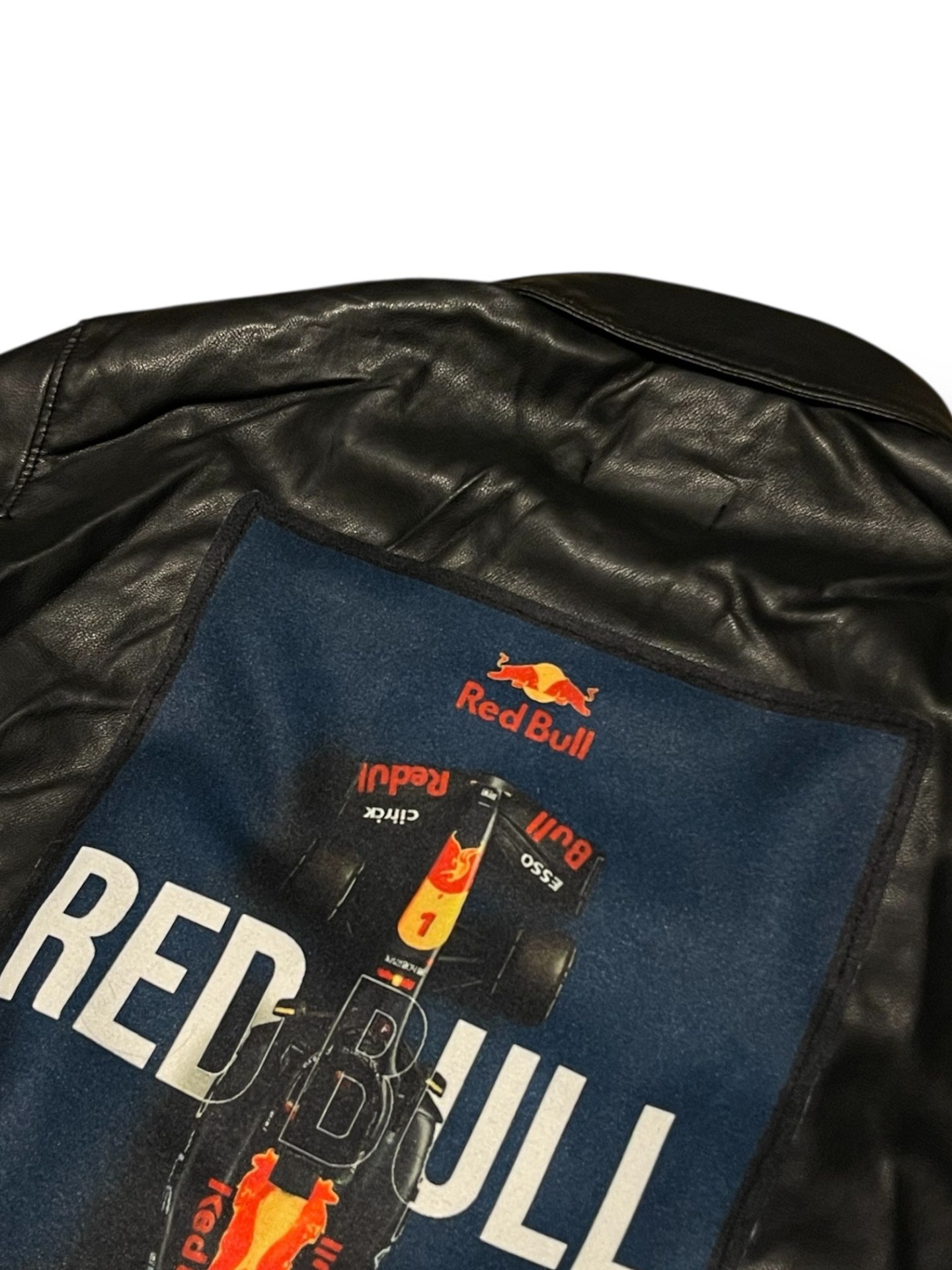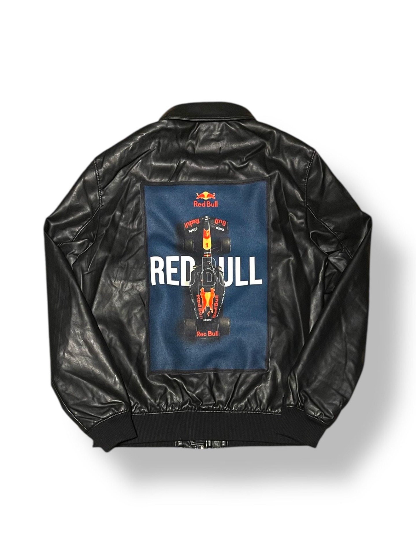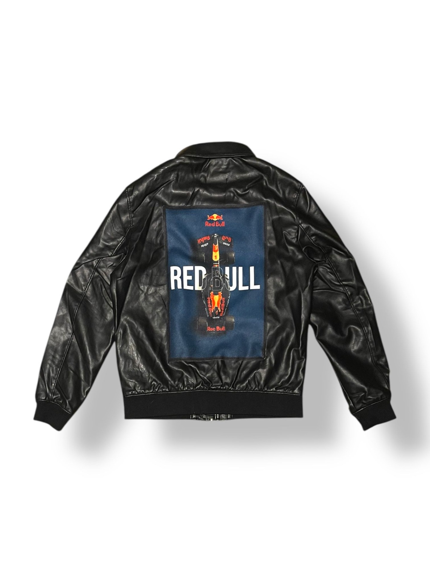 Geacă neagră din piele vegană, cu siluetă clean și prezență puternică, construită ca o piesă statement pentru streetwear-ul care trage din cultura motorsport. Spatele este dominat de patch-ul grafic cu monopost Red Bull Racing, un simbol al vitezei, adrenalinei și obsesiei pentru performanță.