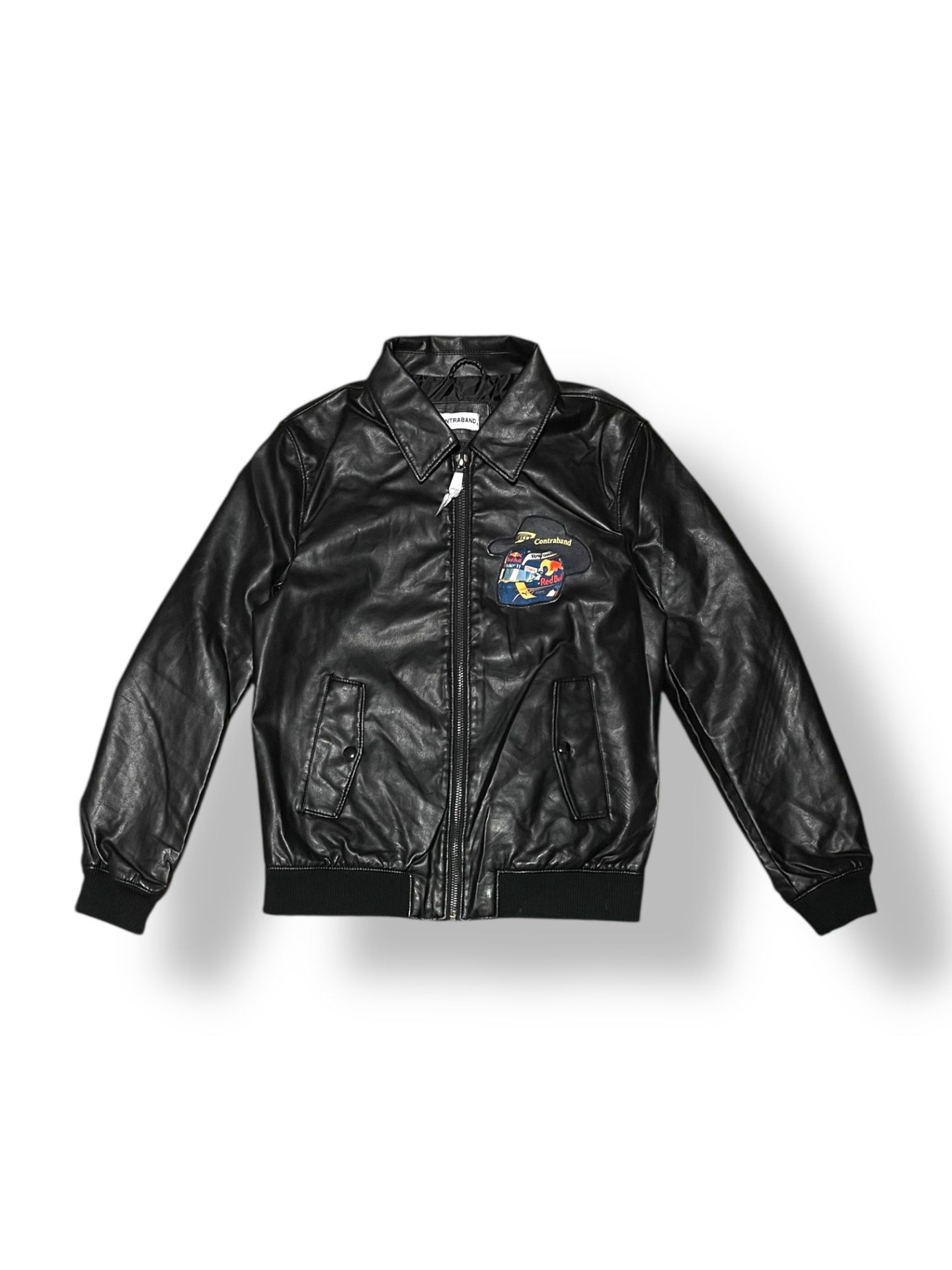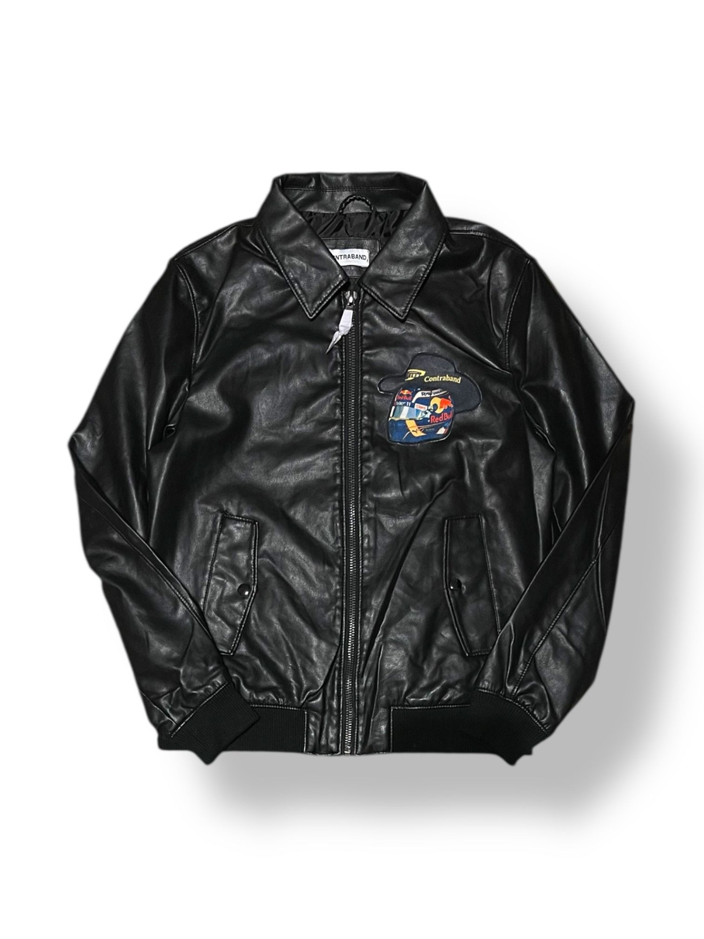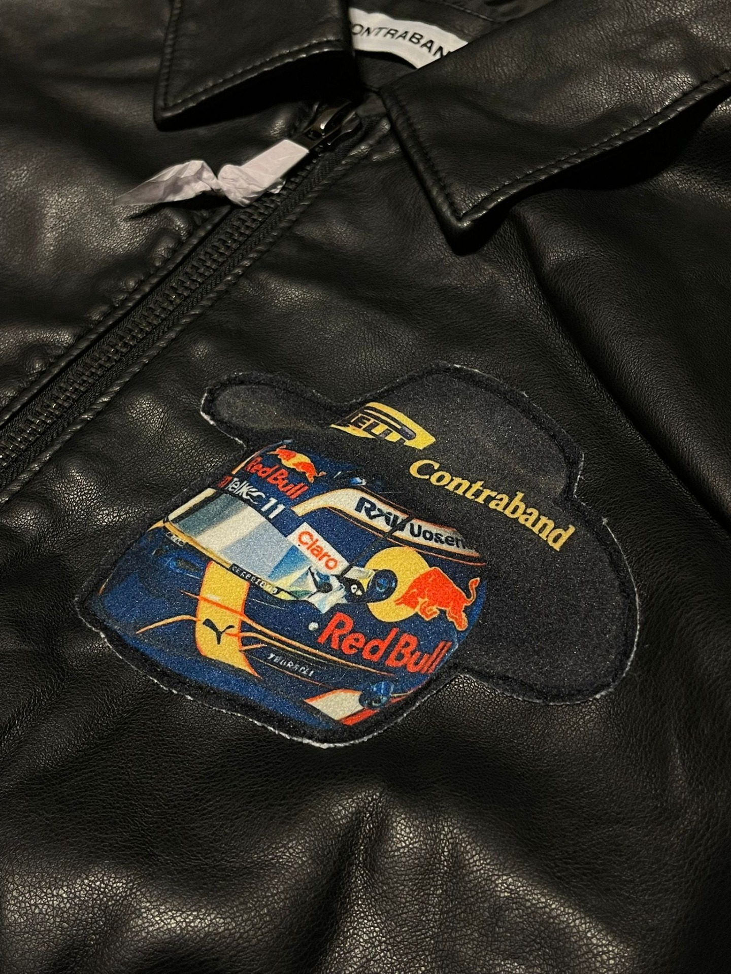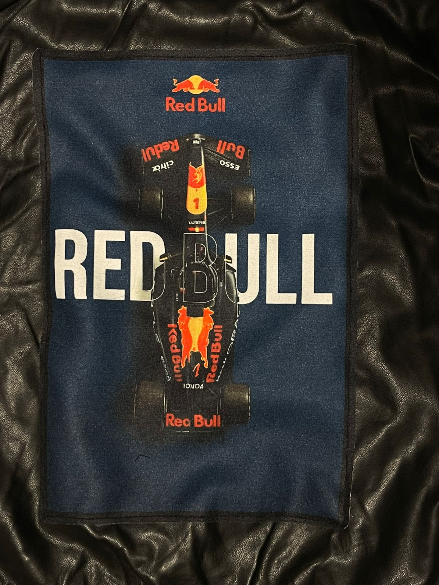 Geacă neagră din piele vegană, cu siluetă clean și prezență puternică, construită ca o piesă statement pentru streetwear-ul care trage din cultura motorsport. Spatele este dominat de patch-ul grafic cu monopost Red Bull Racing, un simbol al vitezei, adrenalinei și obsesiei pentru performanță.