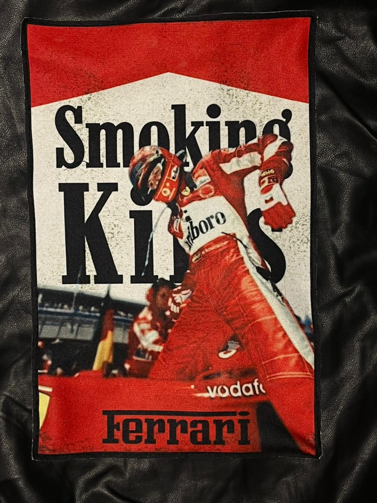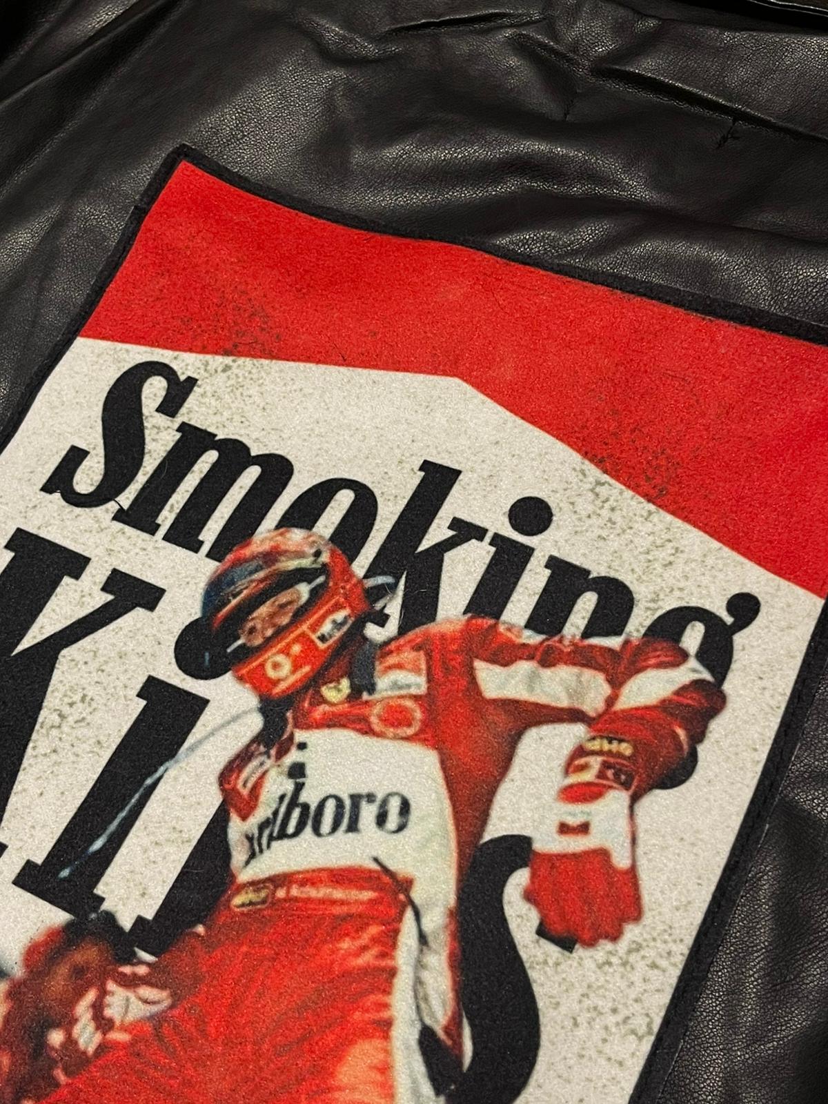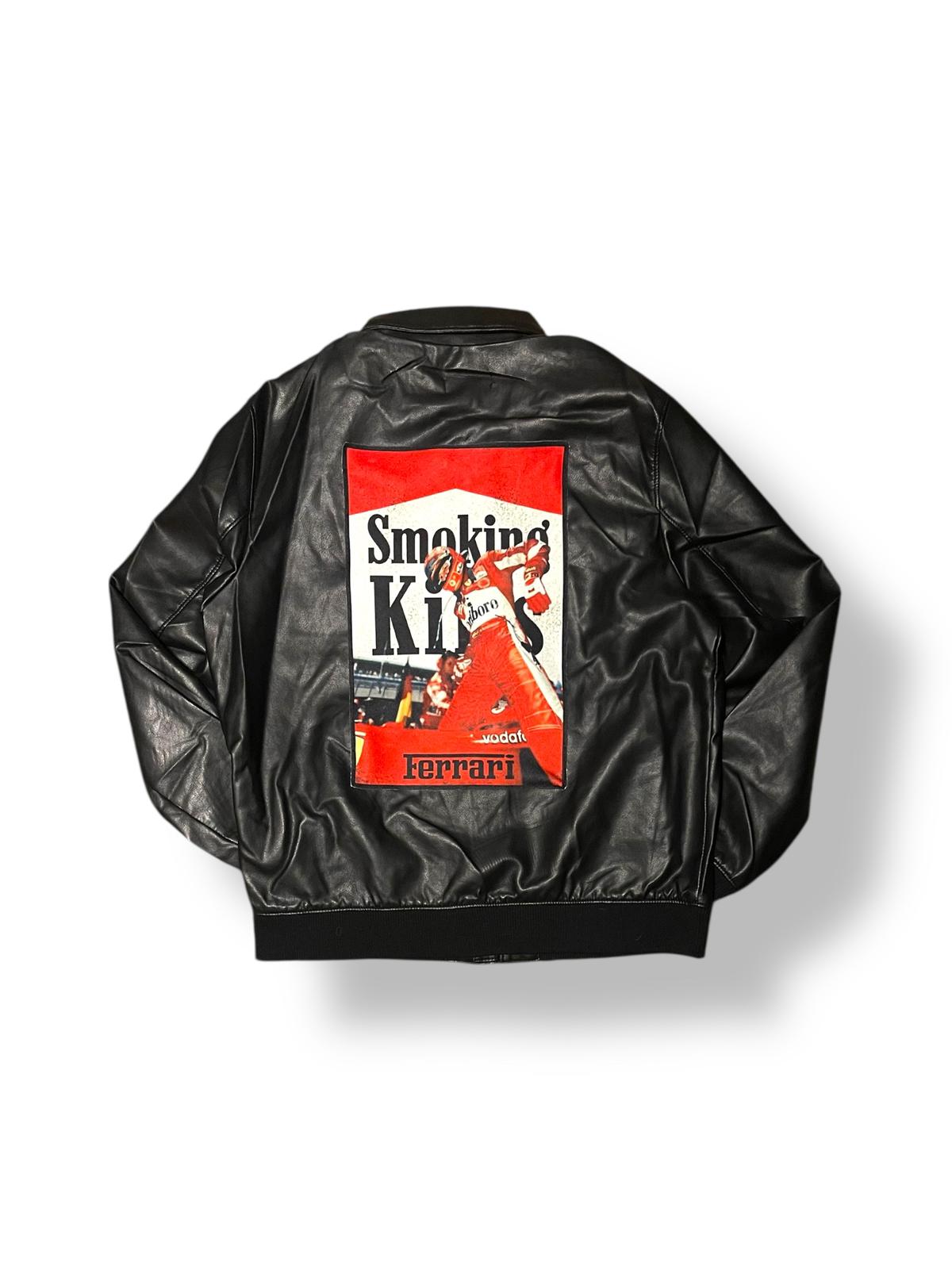 Geacă oversized din piele vegană cu finish mat, inspirată din estetica street și reinterpretată într-o cheie modernă. Piesa de rezistență este patch-ul statement din spate, creat și aplicat manual de mine o intervenție grafică ce remix-ează vizual cultura racing într-un stil bold, ironic și complet urban.