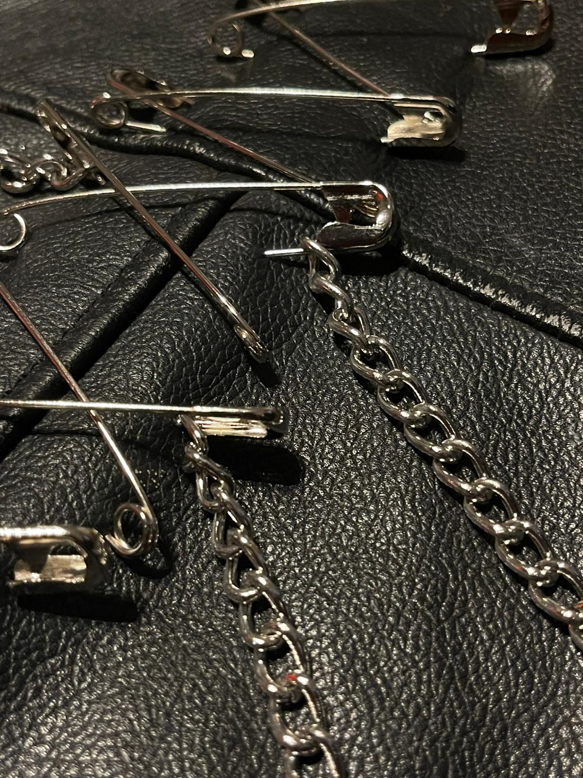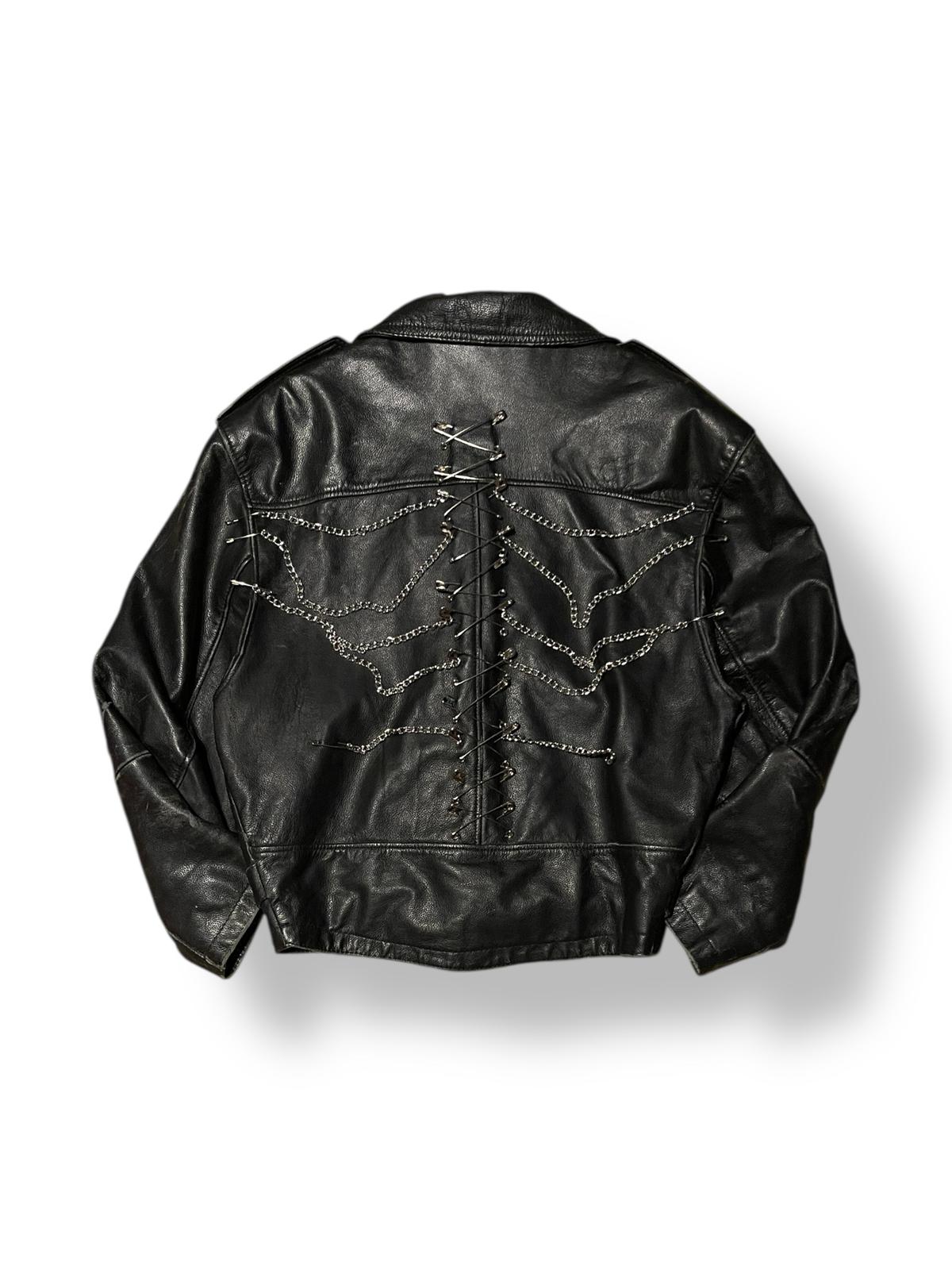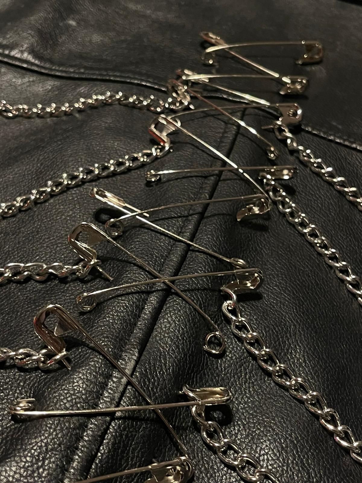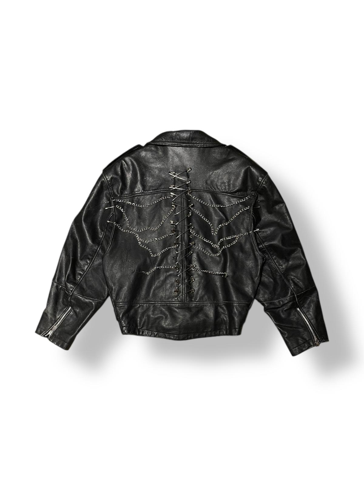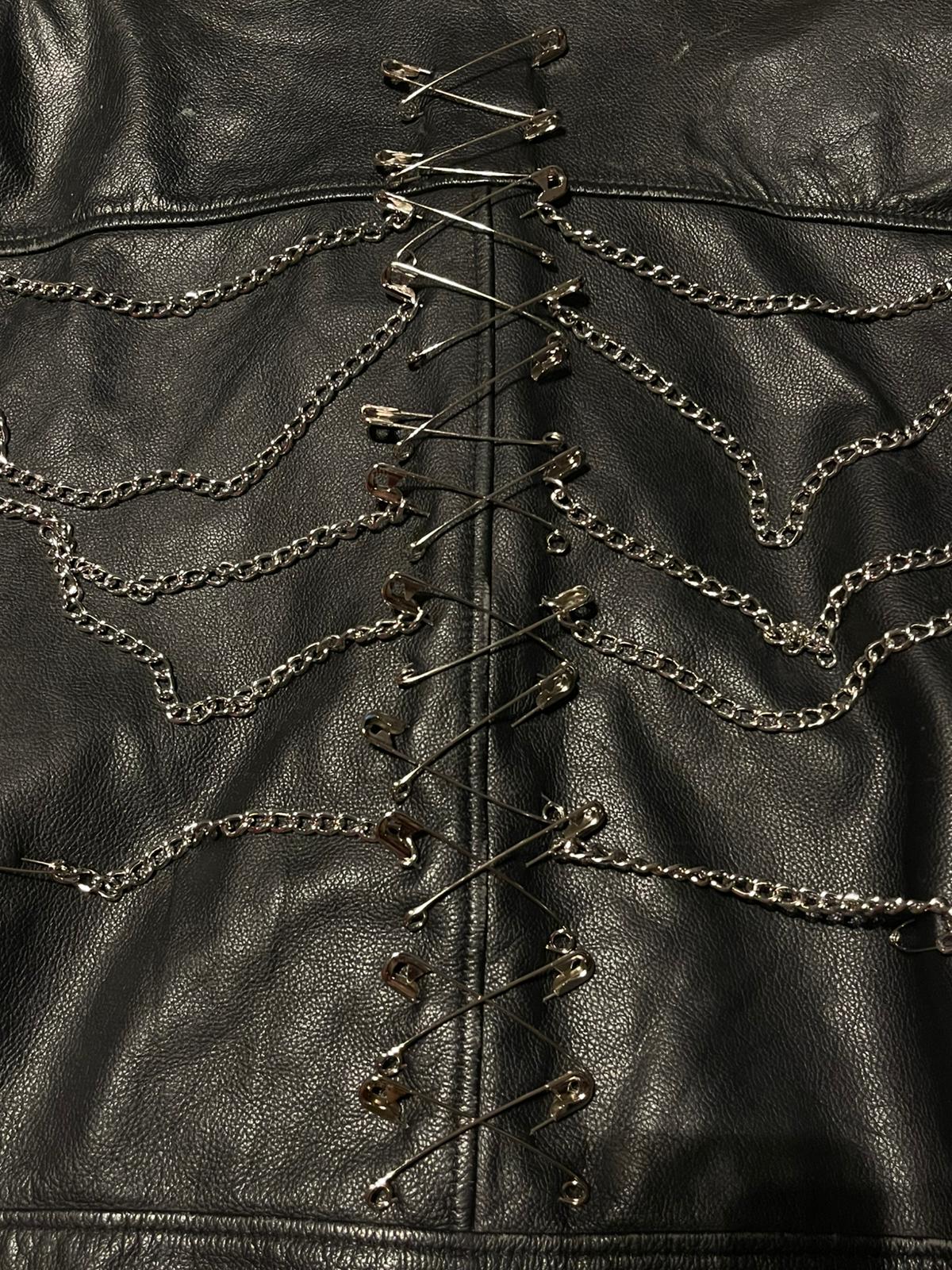 Intră în atmosferă edgy cu această geacă din piele naturală, reinterpretată într-un stil urban contemporan. Piesa de rezistență sunt acele de siguranta si lanturile care sunt aplicate manual, care trasează pe spate un motiv de „coloană vertebrală” cu accente metalice și linii sinuoase, dând gecii o energie raw și o identitate puternică.