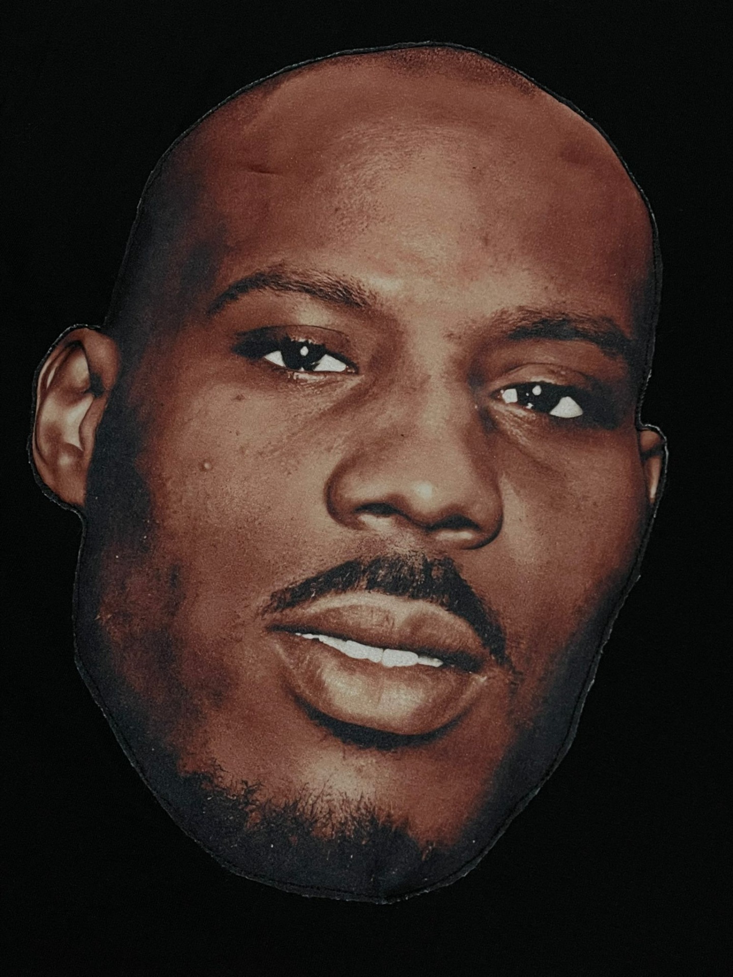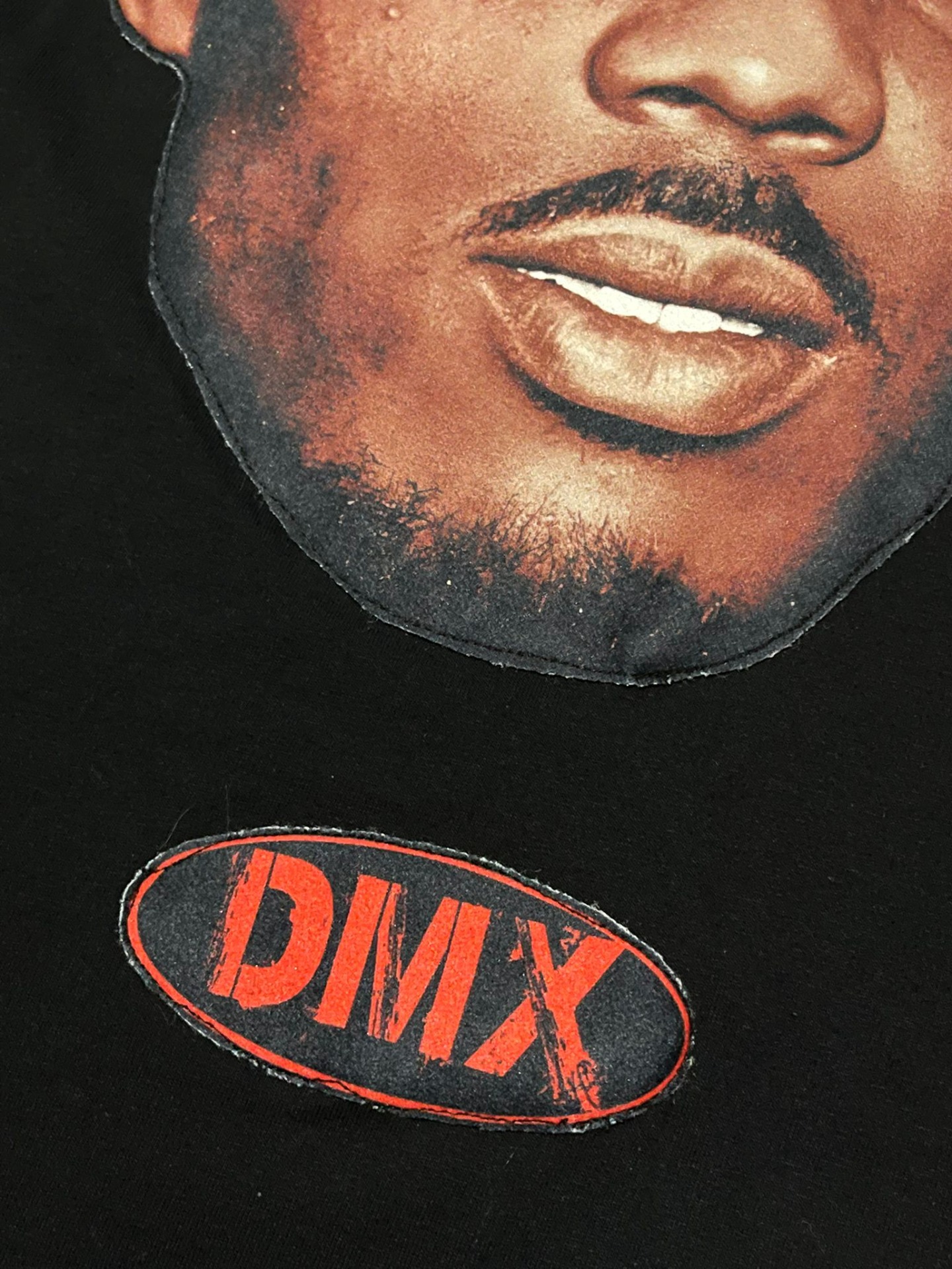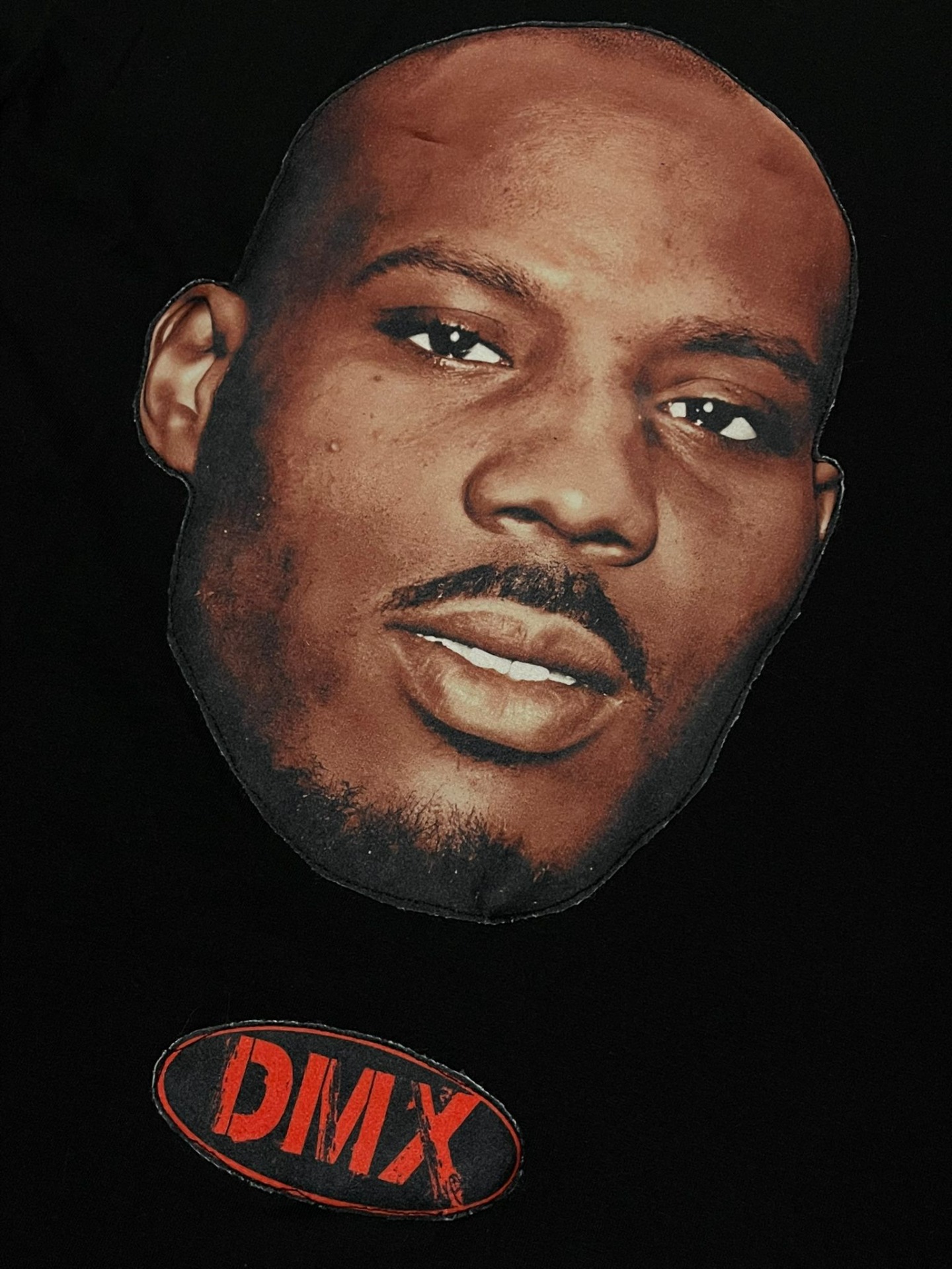 Designul grafic frontal redă portretul expresiv al artistului, imprimat în detalii realiste, cu accente cromatice puternice. Sub imagine, logo-ul "DMX" în roșu adaugă un contrast vizual intens, completând perfect estetica urbană a tricoului.
