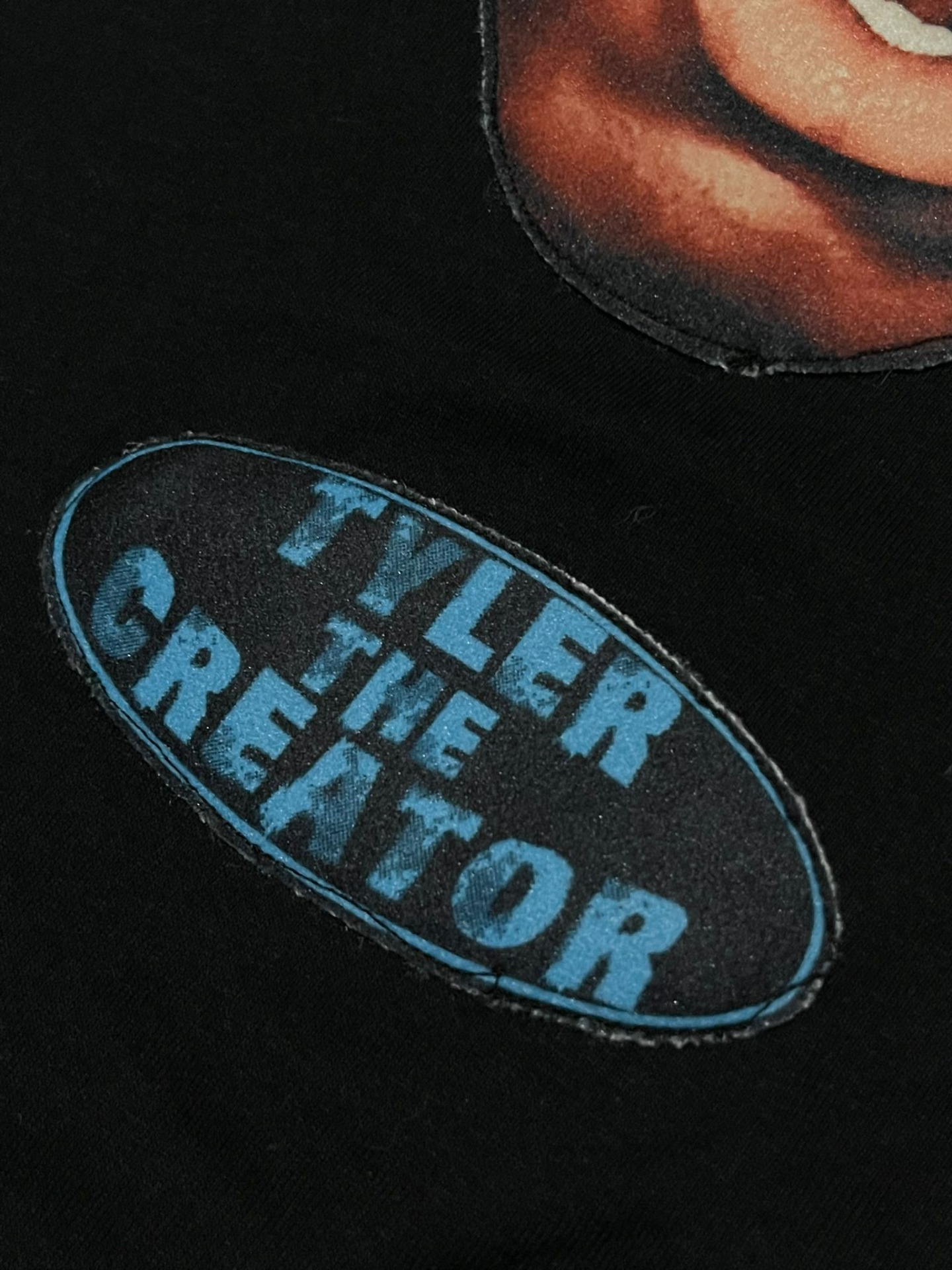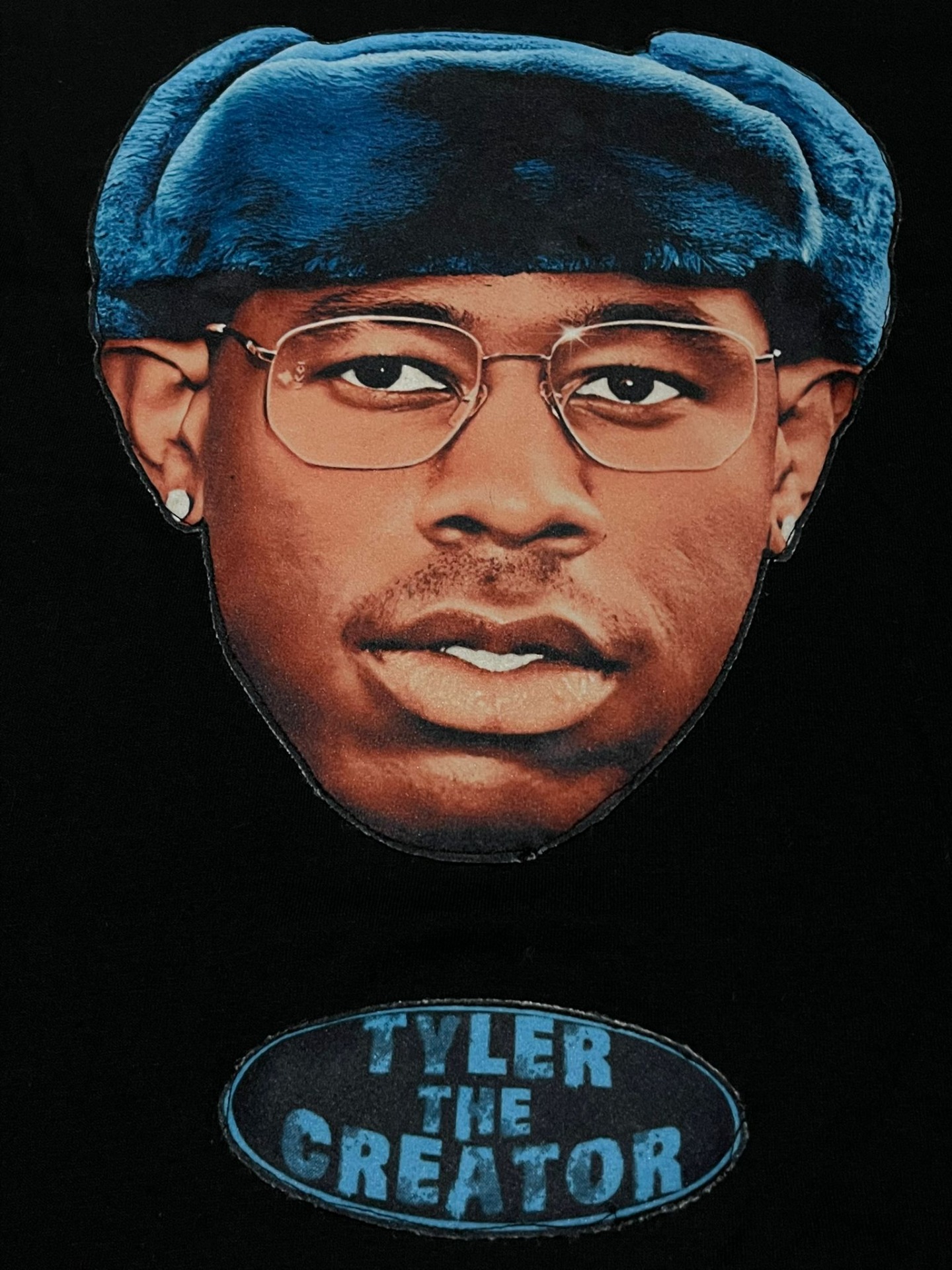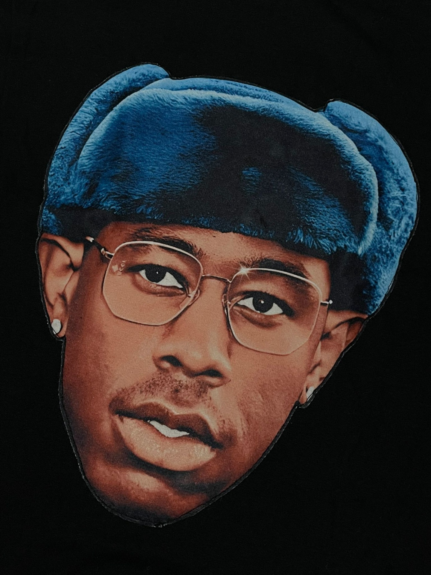 Pe partea frontală, designul grafic vibrant redă chipul expresiv al lui Tyler, cu un efect vizual spectaculos o combinație între artă modernă și cultura streetwear.